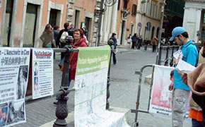 【明慧网2006年4月25日】2006年3月以来,多位证人揭露在中共劳教所和监狱里发生的对法轮功学员活体器官摘除以牟取暴利的兽行后,罗马法轮功学员持续在意大利总理府前和罗马市中心的帝国大道揭露中共的罪恶,呼吁意大利政府和国际社会关注此事,并帮助制止中共的暴行。此外学员们还打出横幅,声援千万民众退出中共。