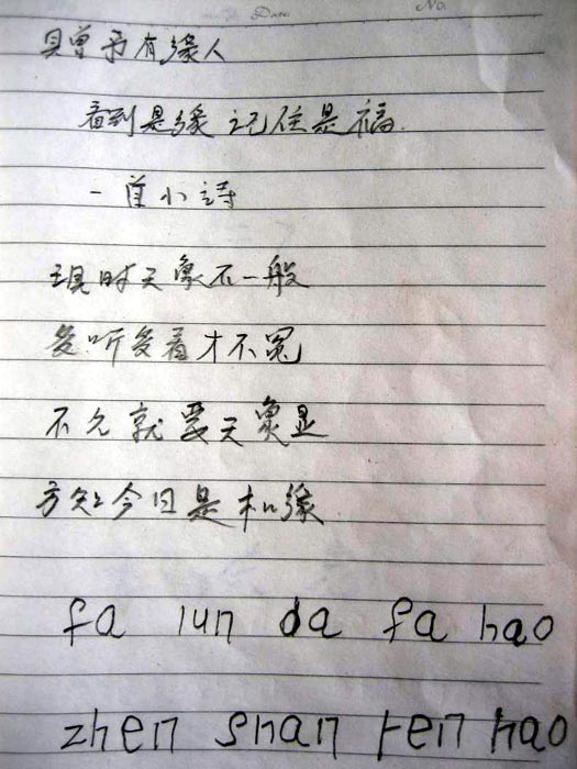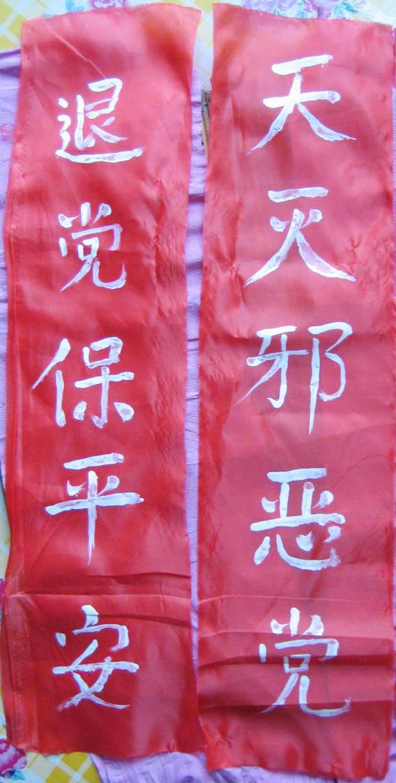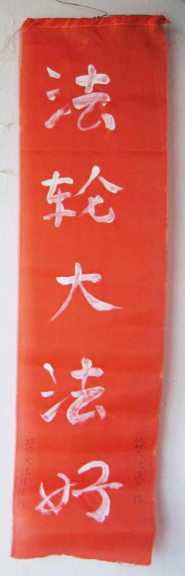 【明慧网2006年4月26日】这是山东某地区的几位老年同修自己制作的真相资料图片,他们年龄大的70多了,年纪小的也将近70,几年来,几位老同修自己制作,自己出去悬挂、张贴,每次都要走很长的路,但他们几年却从未间断过,把大法的美好送给每一个可贵的有缘人。