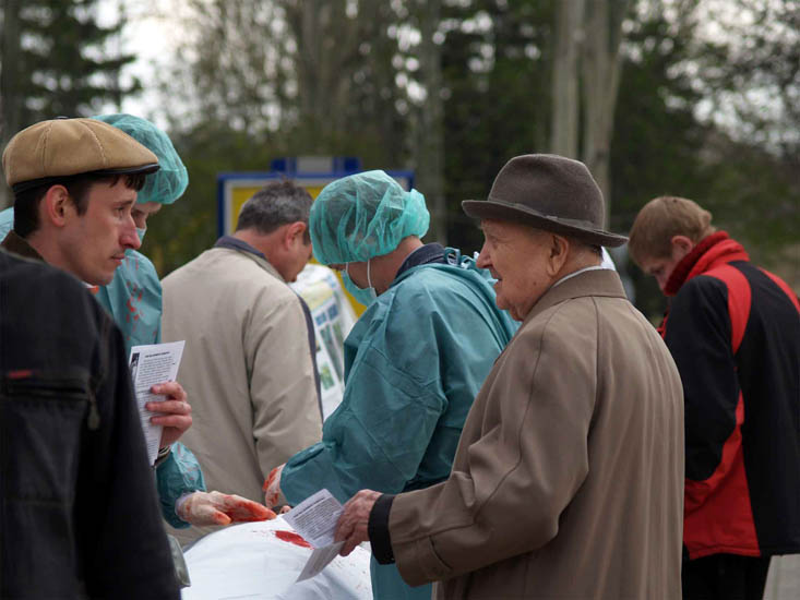 法轮功学员打出的横幅:“让我们的力量制止共产罪行”,“现在在中国的劳教所里法轮功学员的人体器官被摘除”,“尽我们的可能以所有的力量停止这场新的种族灭绝”引来众多民众的驻足观看。人们站在横幅前、展板前、真人模拟展前,静静的观看每一幅画面。年迈的老人看过后,脸上露出沉重的表情;朝气的年轻人看过后,脸上布满严肃的神色;天真无邪的孩童则对画面中中共对待法轮功学员的狠毒与残忍,显现出无比的惊恐。