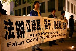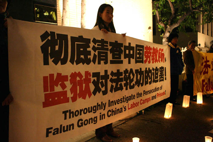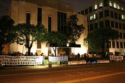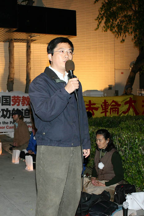 与会者在镶嵌在花圈中的遇难同修遗像前点燃蜡烛,大横幅上写着“法轮大法好”、“停止迫害法轮功”、“法办江泽民、罗干、周永康、刘京”、“彻底清查中国劳教所、监狱对法轮功的迫害”、“抗议中共活体摘除器官、屠杀法轮功学员的罪行”等标语。法轮功学员代表吴英年、桑切斯(Dan Sanchez),中国事务杂志主编伍凡,大纪元洛杉矶分社代表王清华,“赴中国大陆全面调查法轮功受迫害真相委员会”代表曲铮在会上发了言。