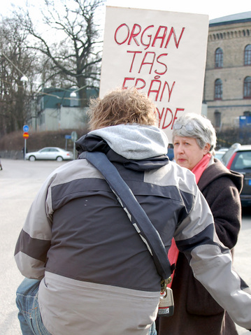 学员们手举着牌子,向路人发传单,并与路人交谈。一位50多岁的男士看到学员手举的牌子说:我听说了中共对法轮功学员盗取器官的事,太可怕了。