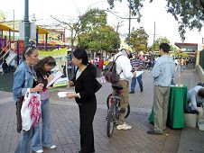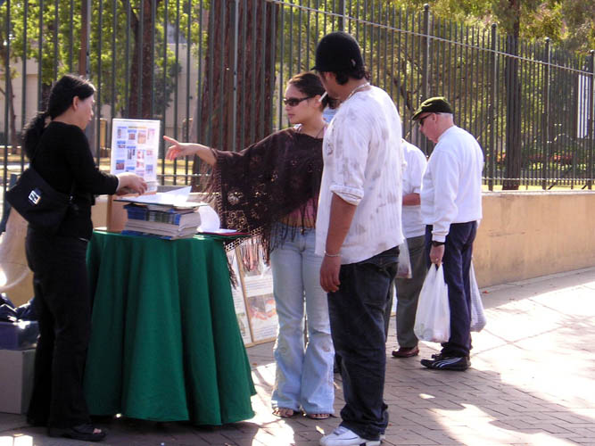 大约到下午一点多钟,两位当地的女大学生过来。其中一位向学员介绍到:“我叫Chantelle Akapi,这位是我的朋友Cara Ferguson(她已有几个月的身孕)。上个星期天我从这里得到一份传单。回家我读了后止不住的流泪。我告诉我的男朋友,告诉所有我能告诉的同学。他/她们无不感到惊讶和愤怒!都说‘当今怎么会有这类事在中国发生?’”Chantelle接着说:“我今天就是特地来这里见你们的。我的朋友Cara Ferguson也与我一道来了。我上网查看了你们网上的资料。我们认为:中共现在对法轮功的迫害是当今世界真正的最大的恐怖事件!”
