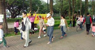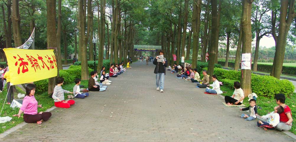 2006年4月1日,一个风和日丽的周末下午,台湾桃园县内坜区的法轮大法弟子到桃园元智大学校园里炼功,这群人当中,有80岁的爷爷,有3、4岁的小朋友。当炼功的音乐声响起,顺着林荫大道的两旁,大家整齐的做着5套优美的功法,柔和的音乐声吸引了走在大道上所有路人的目光。