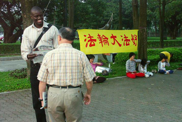 有一位从旁路过的教授被这优美的炼功动作所吸引,在旁边欣赏了很久之后,特地过来要了一份资料,当他明白中共恶党迫害法轮功的真相后表示,愿意将这个消息告诉其他的朋友,共同制止这场迫害。
