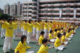 在学校运动会表演功法也是学员常常采用的洪法方式。如在台北县三峡镇安溪国小学校暨社区联合运动大会上,法轮功学员一出场就气势不凡,整齐浩大的队伍、庄严祥和的神态,加上优美的炼功音乐,全体学员随着音乐口令,缓、慢、圆的展示出五套功法的动作,吸引了在场许多嘉宾的注目和赞叹。
