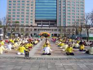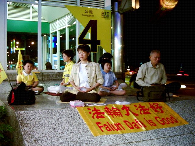 ![]() 板桥县政府新大楼前广场炼功 | ![]() 捷运站出口洪法炼功 | ![]() 向过往路人讲真相 |
