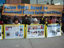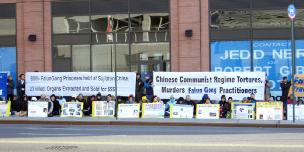 英文大横幅“6000名法轮功学员在中国苏家屯被关押,2/3被杀害,器官被取并被高价出售”、“中共迫害、谋杀法轮功学员”,中文大横幅“抗议中共‘苏家屯秘密集中营’、抗议中共残酷虐杀法轮功学员、抗议中共灭绝人性摘取人体器官发财”在中间特别醒目;两侧是英文大横幅“法轮功:真善忍”和“法轮功基于中国传统文化和美德”。十几块展板展示着中共几十年对中国人民的残酷虐杀,特别是苏家屯屠杀场的罪恶。