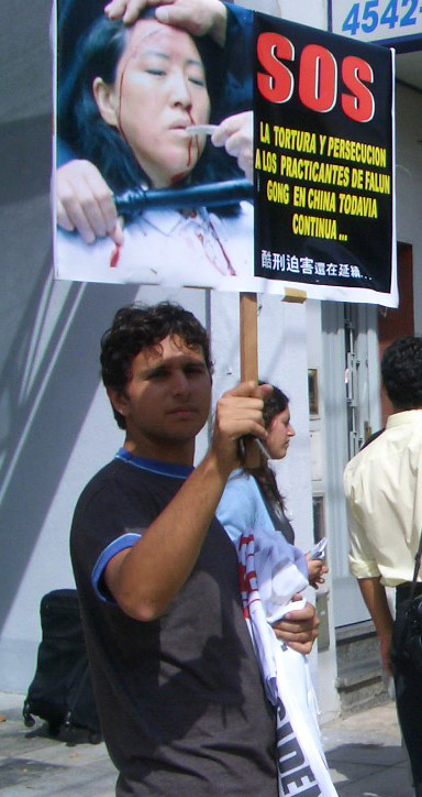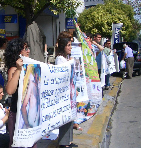 来自阿根廷各地,包括首都布宜诺斯艾利斯、土库曼、门多萨(Mendoza),科多巴(Cordorba),及著名港市罗萨里欧(Rosario)和来自美国、加拿大、澳大利亚的法轮功学员及社会各界支持人士在中使馆前举起横幅和标语,抗议中共在苏家屯活体摘取人体器官的惊天暴行,呼吁制止中共对亿万法轮功学员的迫害。