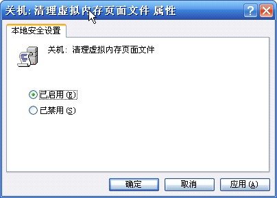 然后鼠标右键点击右侧面板中“关机:清理虚拟内存页面文件”这一策略。出现如下对话框,选中“已启用”,点击确定即可。