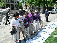 (明慧记者肖妍蒙特利尔报导)2006年4月29日,加拿大蒙特利尔法轮功学员在唐人街中山公园集会,纪念4.25法轮功学员和平上访七周年,揭露中共迫害法轮功的真相,模拟展示中共活体摘取法轮功学员器官的罪恶,呼吁各界正义人士加入赴中国调查真相委员会,彻底清查中共所有关押法轮功学员的劳教所、监狱对法轮功学员的迫害。