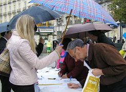 在西班牙马德里最热闹的市中心太阳门广场,声援1000万中国勇士退出中共的活动于2006年4月21日星期五举行,活动同时还强烈抗议中共群体虐杀法轮功学员、活体摘取贩卖器官、焚尸灭迹的残暴行径。