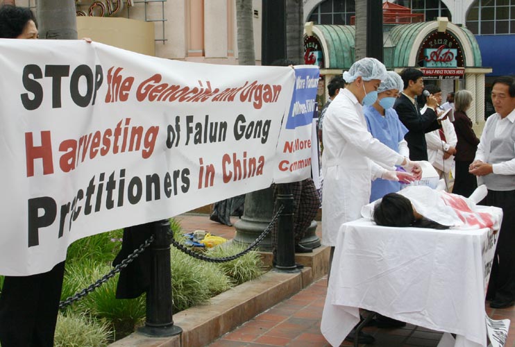 集会人士打出大量标语横幅和展板,并现场演示中共活体摘取法轮功学员器官的惨烈场面。善良的美国民众听到真相后对中共的残暴表示出极大愤慨,纷纷询问如何帮助制止中共的恶行。