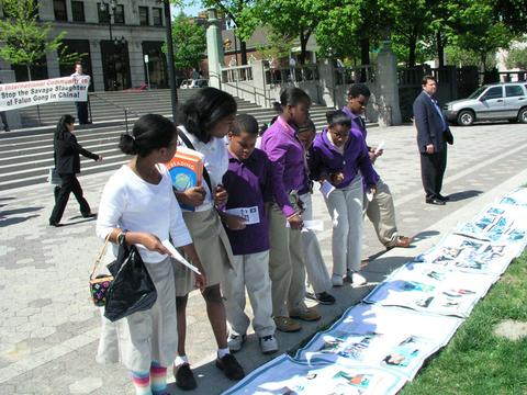 很多行人,包括泰勒和她的同伴及老师,都被迫害真相所震惊,纷纷在谴责中共迫害法轮功的签名本上签名。路过这里的玛格忒女士说:“这太恐怖了,中共应该从中国消失;我愿上帝保佑他们(中国的法轮功学员)。”