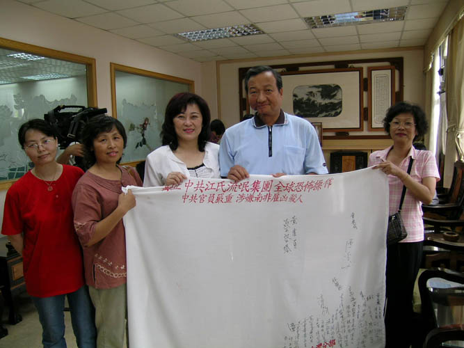 ![]() 90多岁的前县议员王文昭 于“制止中共践踏人权”活动致词 | ![]() 花莲市长蔡启塔与夫人签名支持 “制止中共江氏流氓集团全球恐怖操作” |