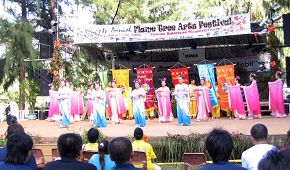 艺术节期间,法轮功学员还获得在舞台上表演的机会,将大唐神韵的舞蹈和法轮功五套功法展示给人们。悦耳的乐曲,庄重、华丽的服饰,柔雅的古装女子,再现的大唐神韵震撼在场的观众。随着舞台上功法的演示,台下许多人也随着音乐与口令开始一起炼功。大法的美好最能熔炼人心啊!