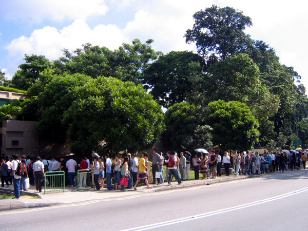 新加坡法轮功学员自2005年7月开始每天上午在中使馆前挂上横幅,抗议中共迫害法轮功,风雨不断。