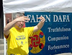 学员们不停的演示五套功法,人们不自觉的驻足,凝神观赏学员炼功,有的索性跟学员当场学功,有学员适时的解释功理,以便人们看的更明白。