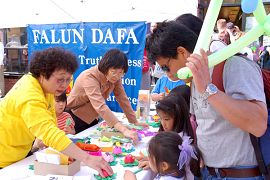 一大早,法轮功学员就布置好展位,各种真相资料、叠纸莲花的彩纸摆的整整齐齐。快到中午时,更多的学员相继而来,有年过花甲的长者,有携儿带女的父母,有驱车来的,更有汽车换地铁,地铁换汽车辗转而来的,大家都有一个共同心愿--把法轮大法的美好和法轮功学员无辜受中共迫害的真相带给每个人。