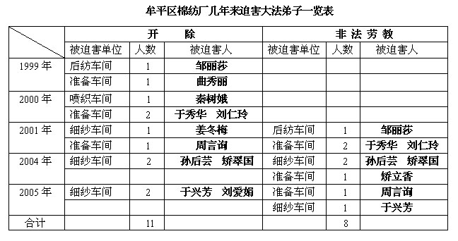 然而不幸的是,当这场象“文革”一样对法轮功的迫害运动自上而下的爆发之后,棉纺厂竟成为牟平地区迫害大法弟子最严重的单位。在人性良知和官职利益面前,都本仁选择了后者。牟平棉纺厂在总经理都本仁的直接授意下,从一开始就追随江氏和中共恶党对自己的职工不断进行着迫害。几年间,被其开除和非法劳教的大法弟子竟达十几人,到如今仍然在继续着。
