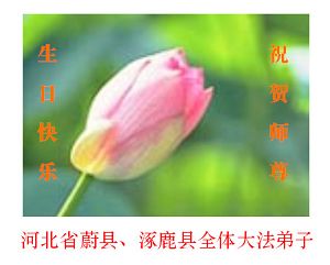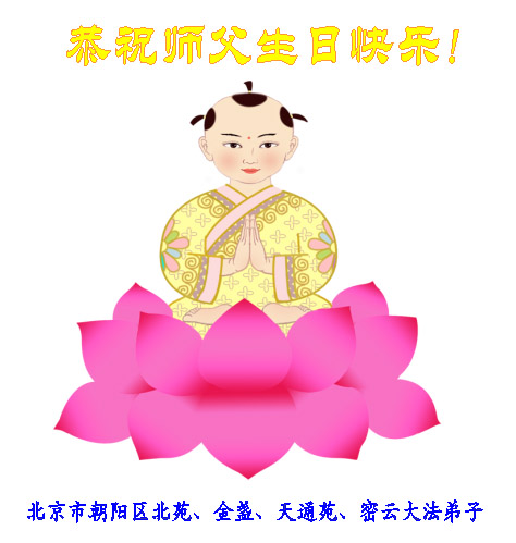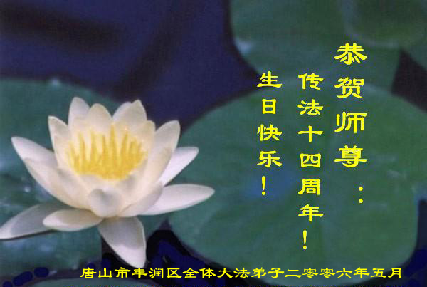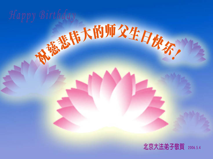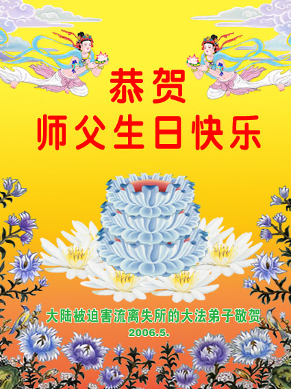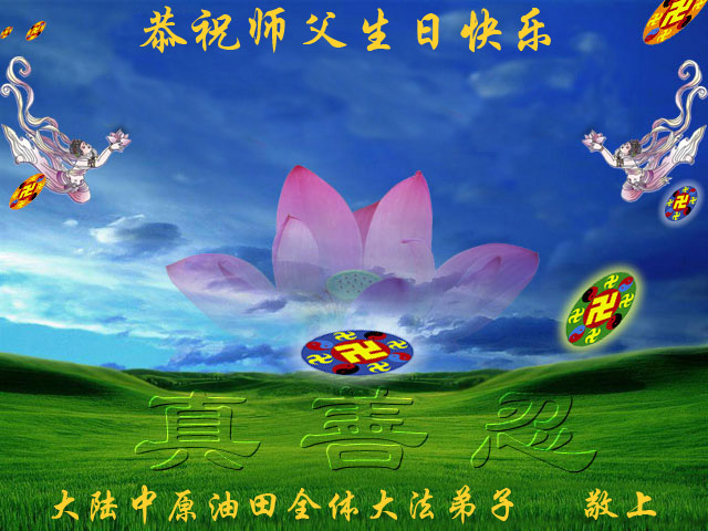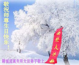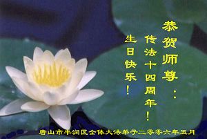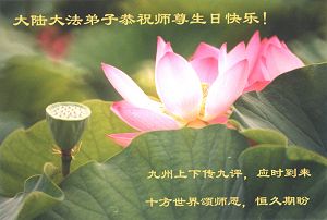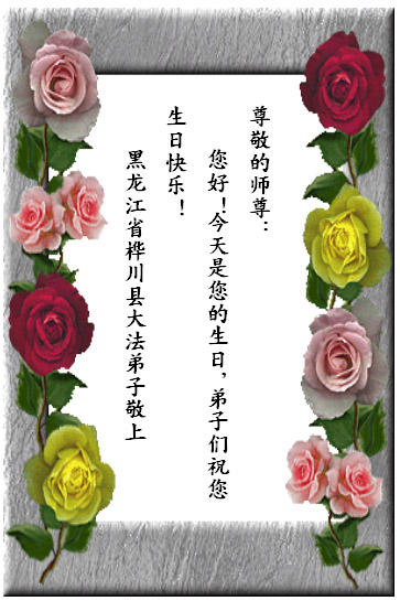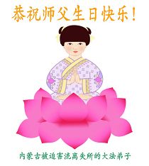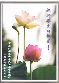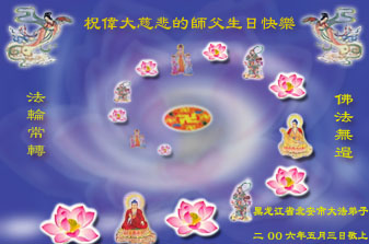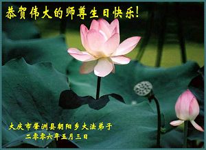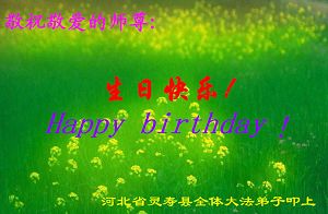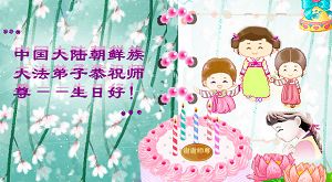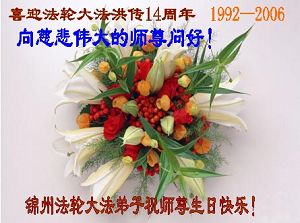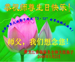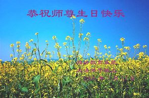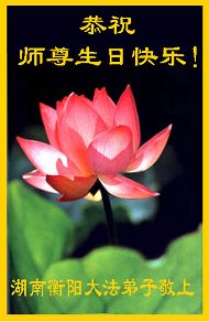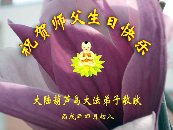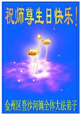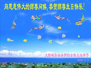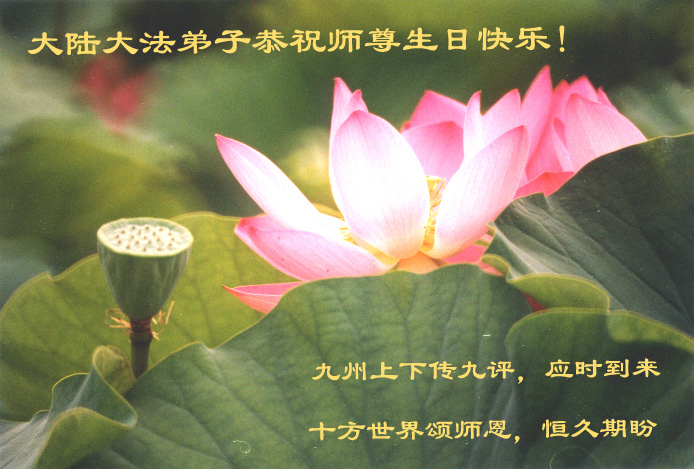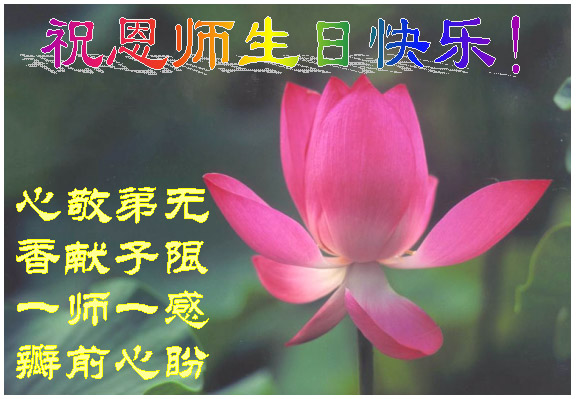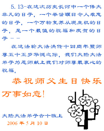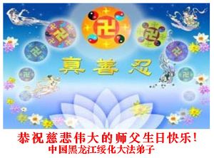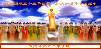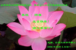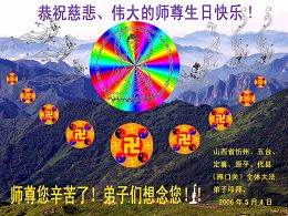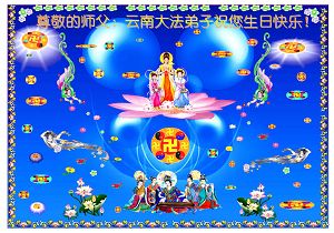 在这法轮大法洪传十四周年暨师尊五十五华诞之际,我们大陆大法弟子为恩师献上我们对师尊最衷心的祝福,恭祝师父生日快乐!万事如意!