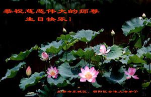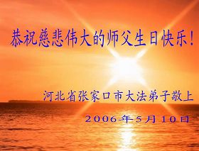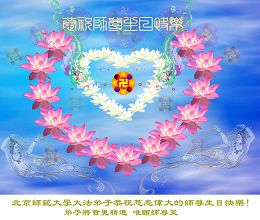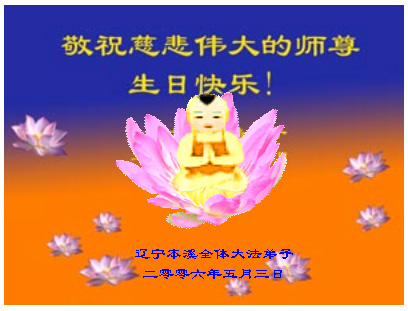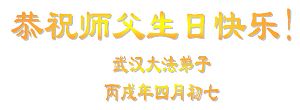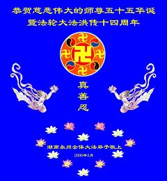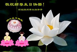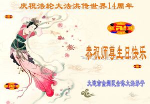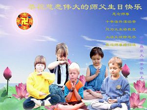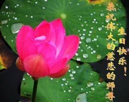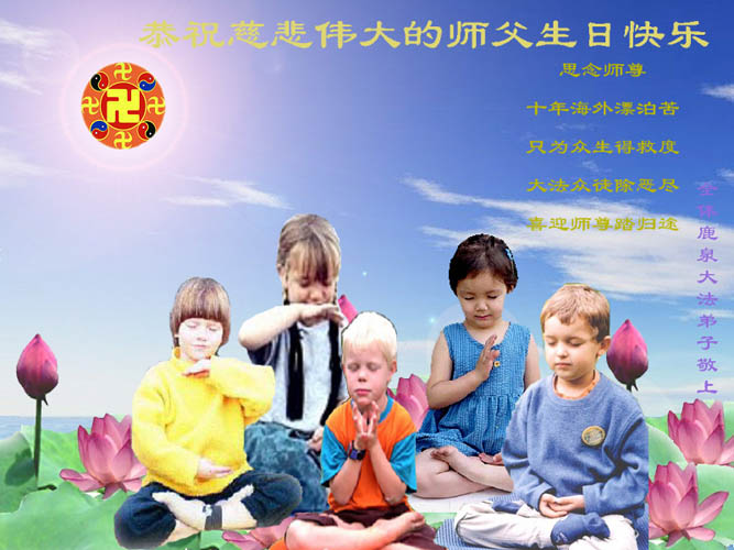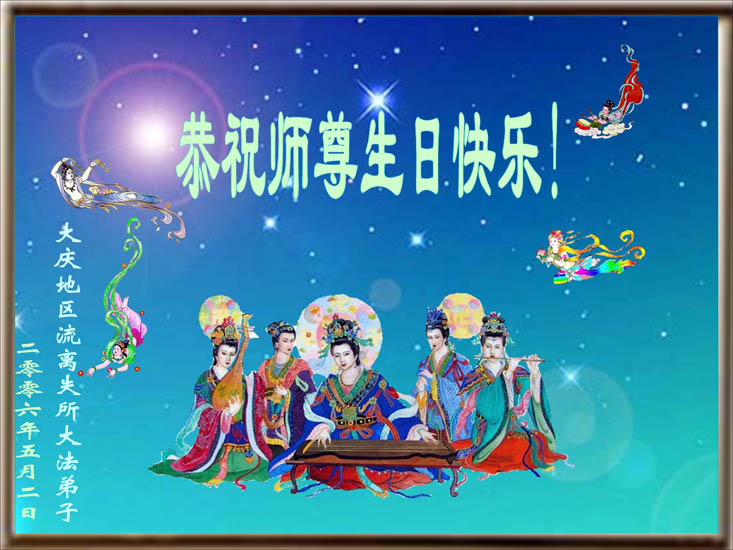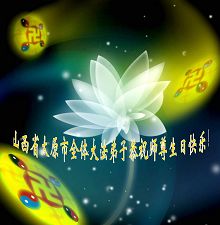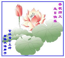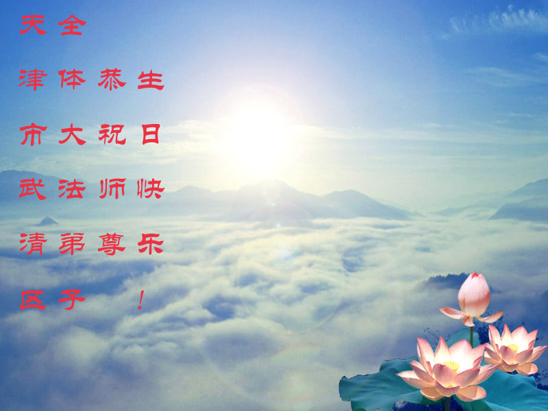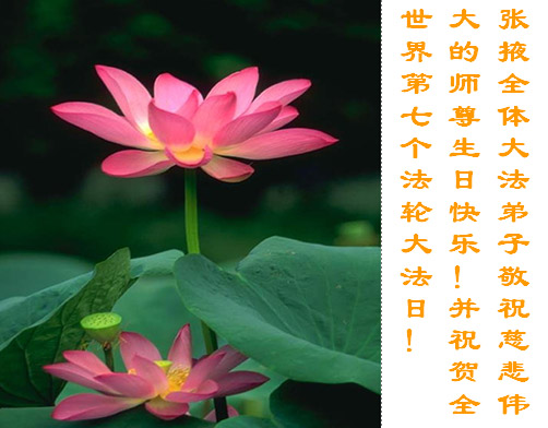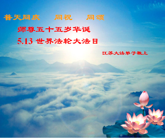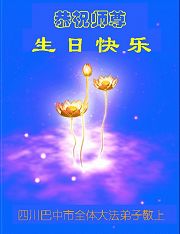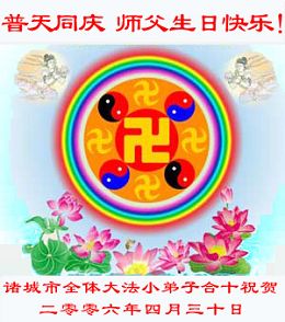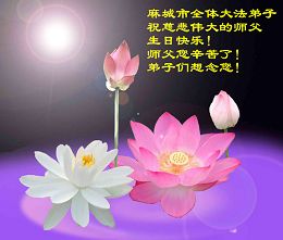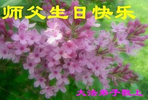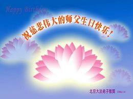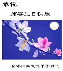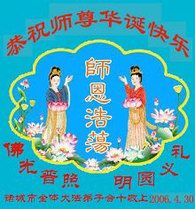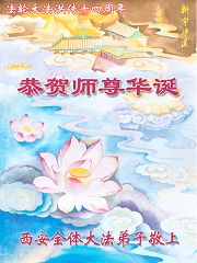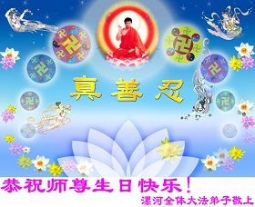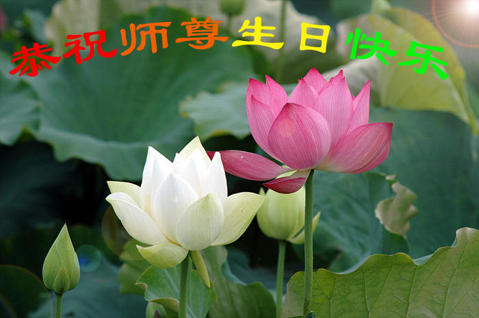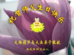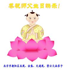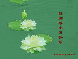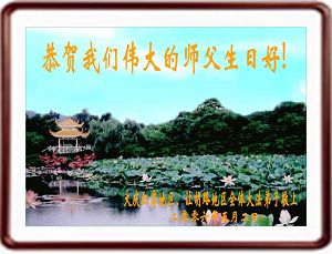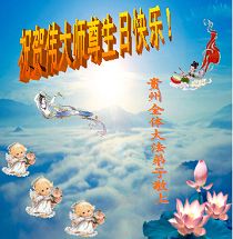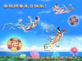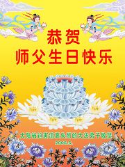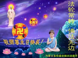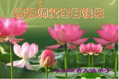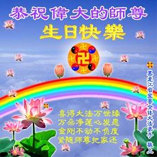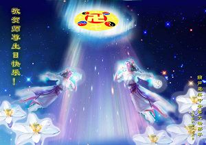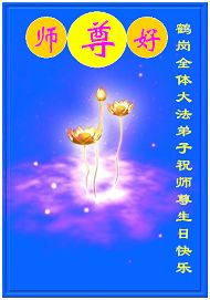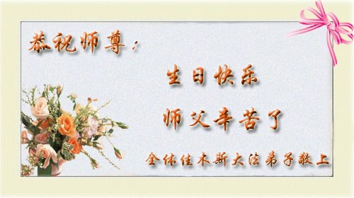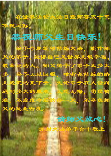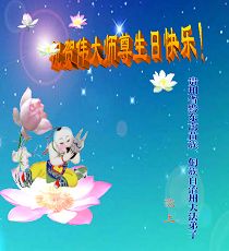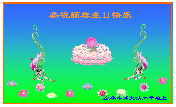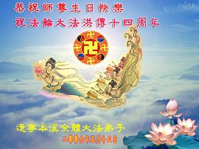 师尊,您为我们承受与付出的太多太多,沐浴在您的浩荡佛恩下,我们觉得好幸运!用尽人类的语言来赞颂师父与大法都无法表达我们的敬意!在这个最伟大的日子即将到来之际,我们敬祝慈悲伟大的师尊五十五华诞暨法轮大法洪传十四周年!谢谢师尊的慈悲苦度与浩荡佛恩!凭着对师尊和大法的正信与坚定,我们一定走好走正今后的大法路,救度更多的世人,请师尊放心!能让师尊多一份宽慰,少一份操劳是我们最大的心愿!