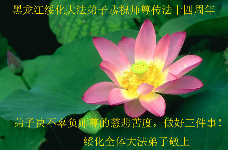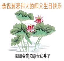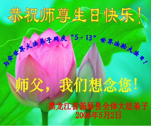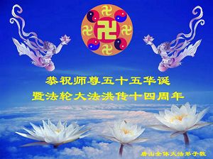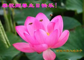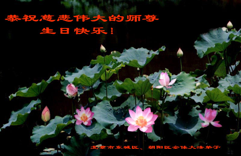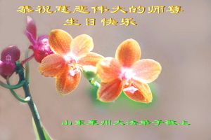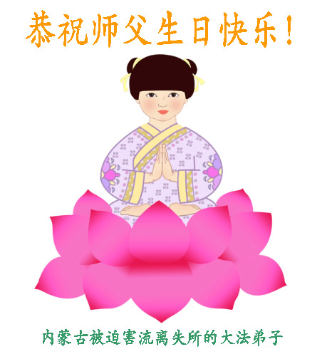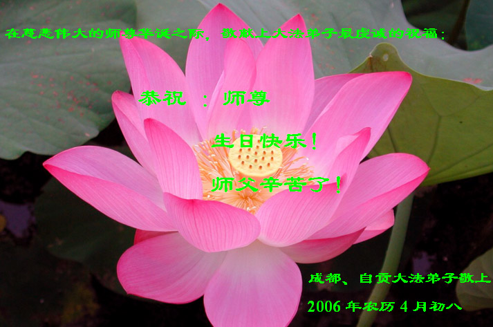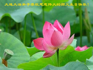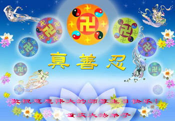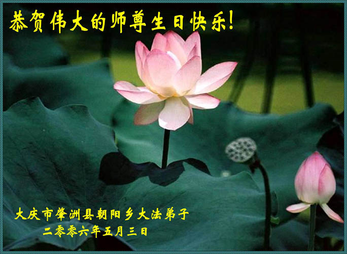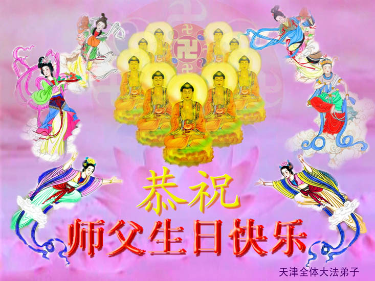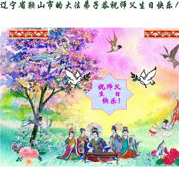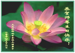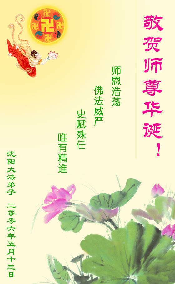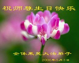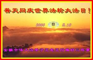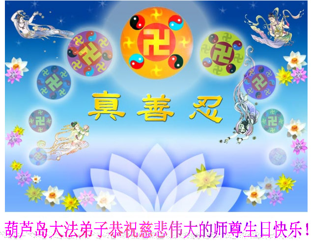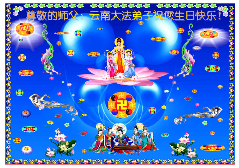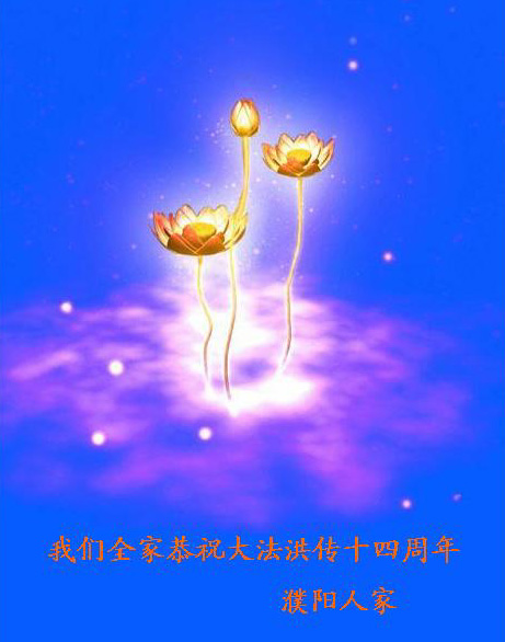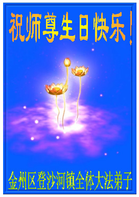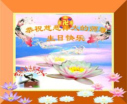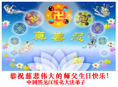 师尊,您为我们承受与付出的太多太多,沐浴在您的浩荡佛恩下,我们觉得好幸运!用尽人类的语言来赞颂师父与大法都无法表达我们的敬意!在这个最伟大的日子即将到来之际,我们敬祝慈悲伟大的师尊五十五华诞暨法轮大法洪传十四周年!谢谢师尊的慈悲苦度与浩荡佛恩!凭着对师尊和大法的正信与坚定,我们一定走好走正今后的大法路,救度更多的世人,请师尊放心!能让师尊多一份宽慰,少一份操劳是我们最大的心愿!