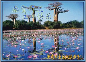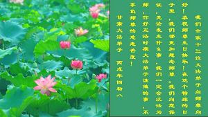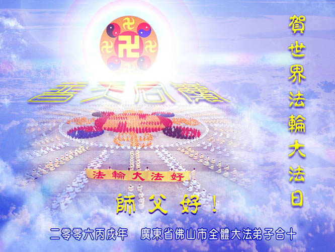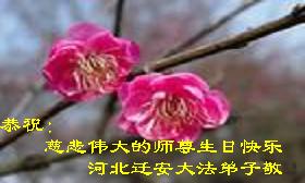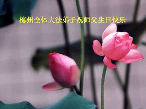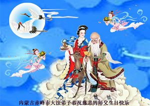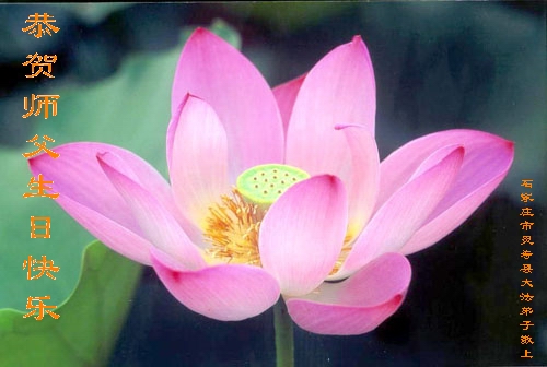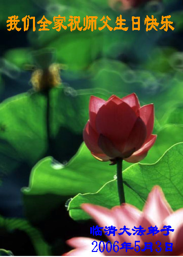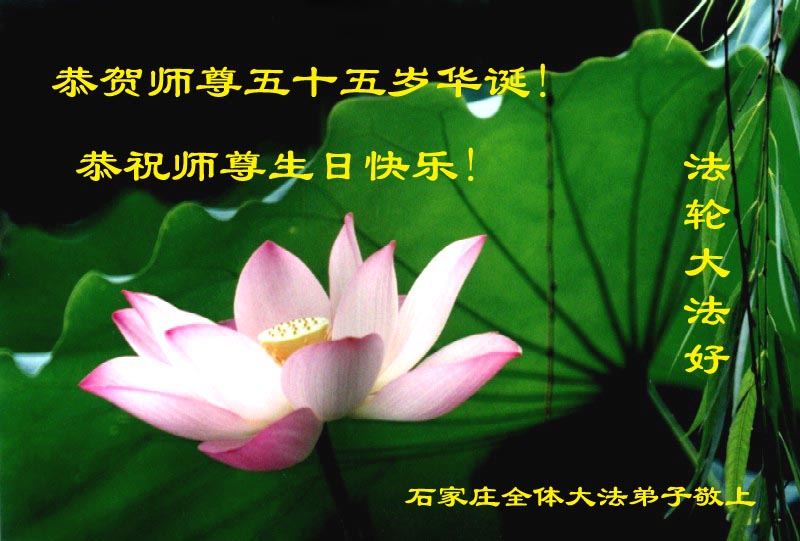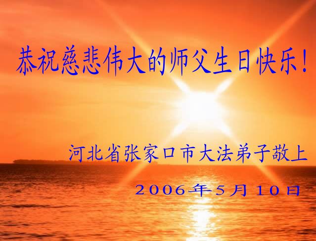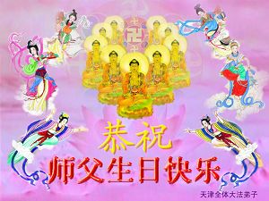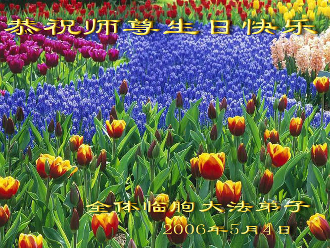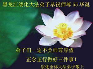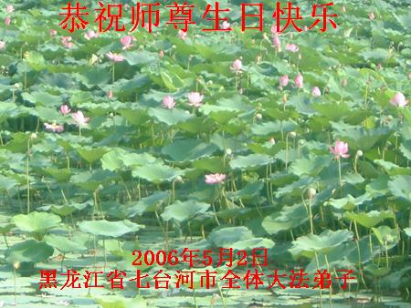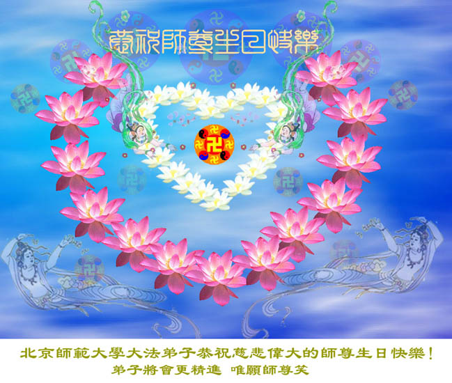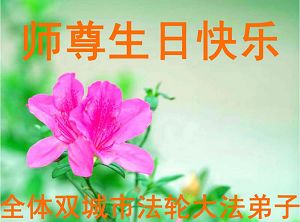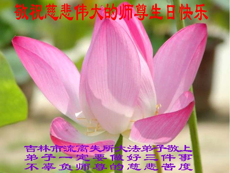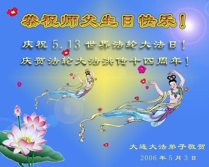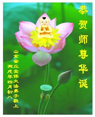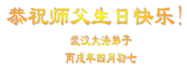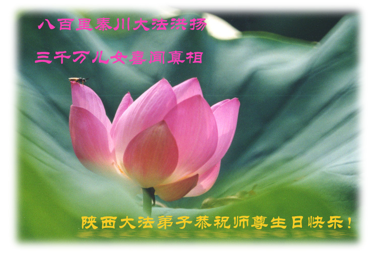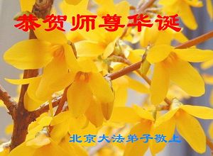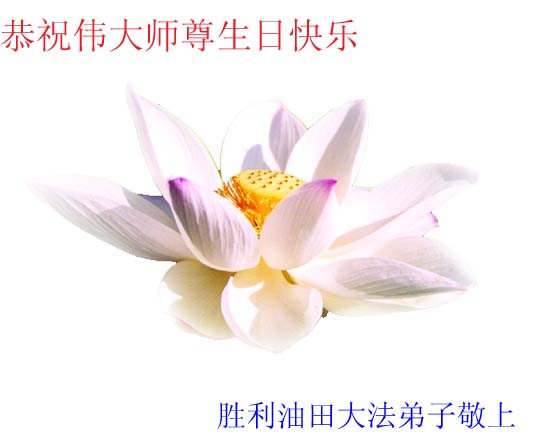 师尊,您为我们承受与付出的太多太多,沐浴在您的浩荡佛恩下,我们觉得好幸运!用尽人类的语言来赞颂师父与大法都无法表达我们的敬意!在这个最伟大的日子即将到来之际,我们敬祝慈悲伟大的师尊五十五华诞暨法轮大法洪传十四周年!谢谢师尊的慈悲苦度与浩荡佛恩!凭着对师尊和大法的正信与坚定,我们一定走好走正今后的大法路,救度更多的世人,请师尊放心!能让师尊多一份宽慰,少一份操劳是我们最大的心愿!