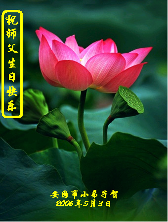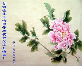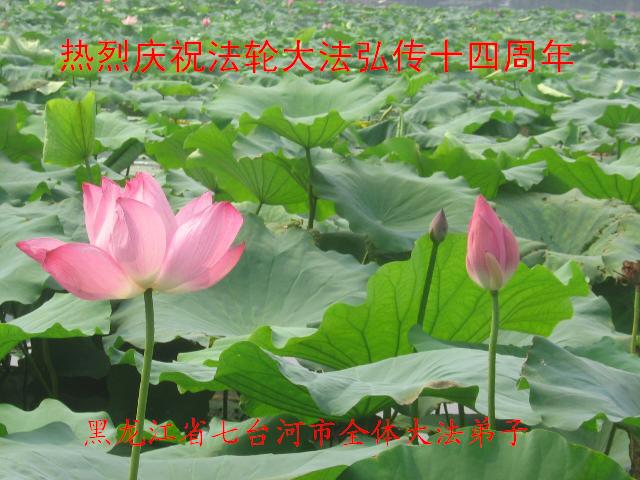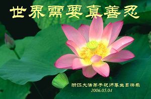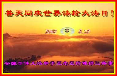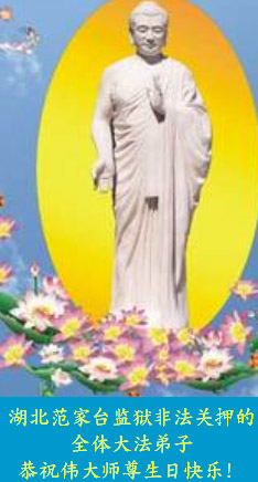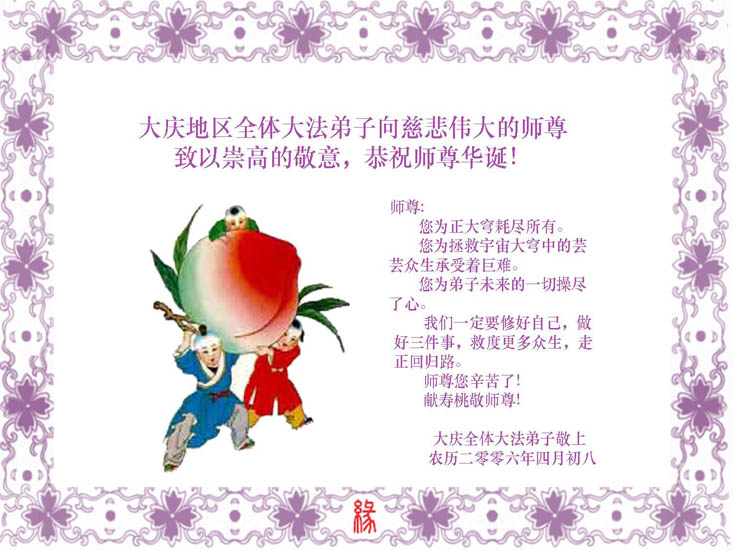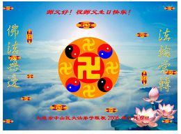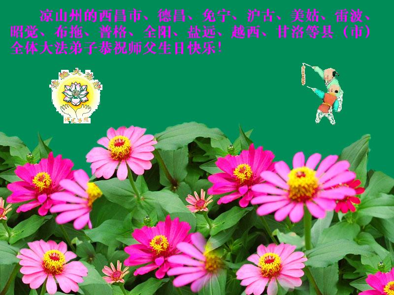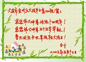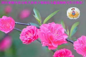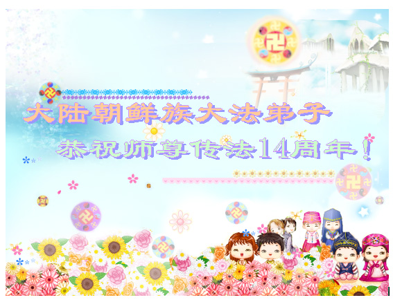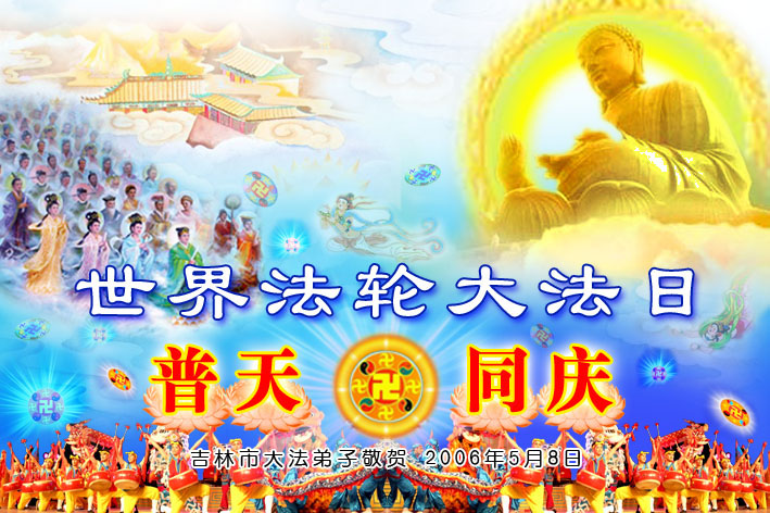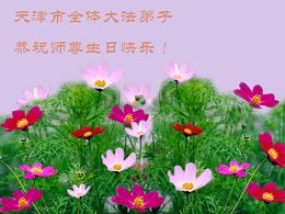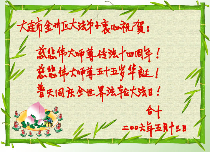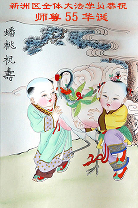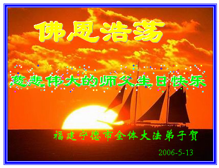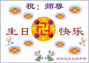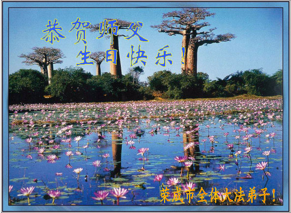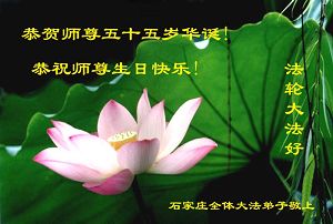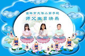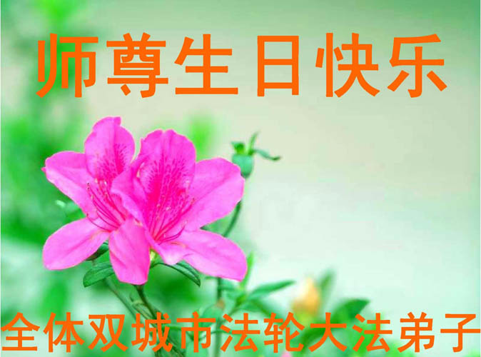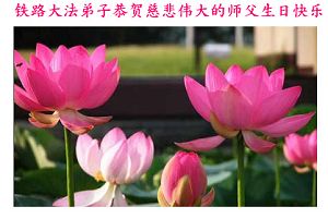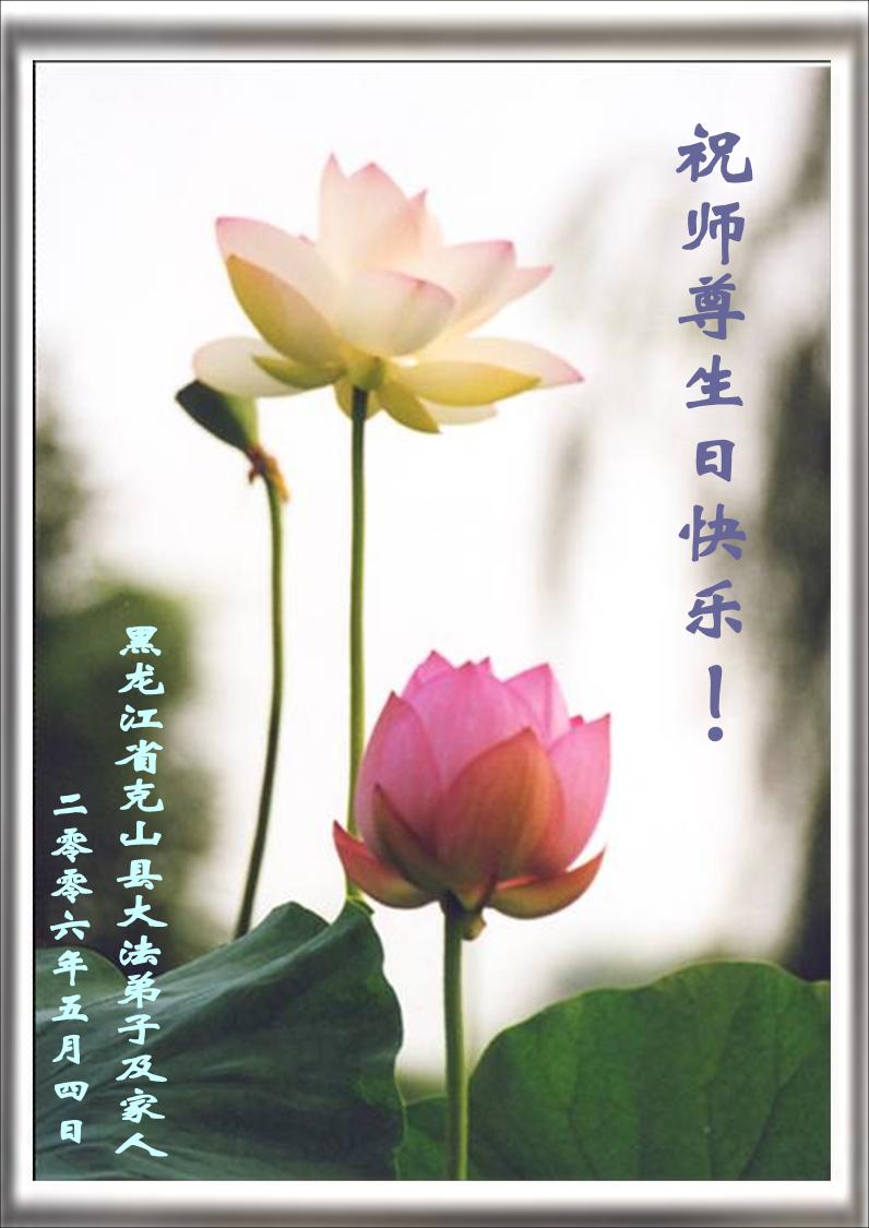 师尊,您为我们承受与付出的太多太多,沐浴在您的浩荡佛恩下,我们觉得好幸运!用尽人类的语言来赞颂师父与大法都无法表达我们的敬意!在这个最伟大的日子即将到来之际,我们敬祝慈悲伟大的师尊五十五华诞暨法轮大法洪传十四周年!谢谢师尊的慈悲苦度与浩荡佛恩!凭着对师尊和大法的正信与坚定,我们一定走好走正今后的大法路,救度更多的世人,请师尊放心!能让师尊多一份宽慰,少一份操劳是我们最大的心愿!