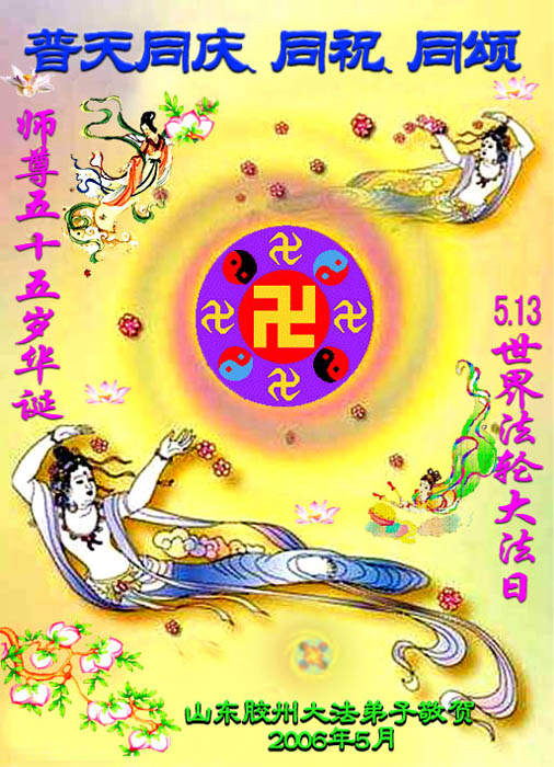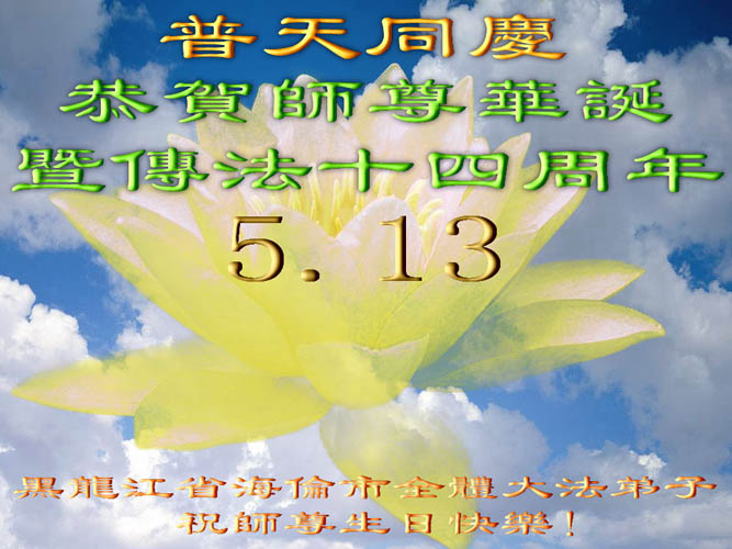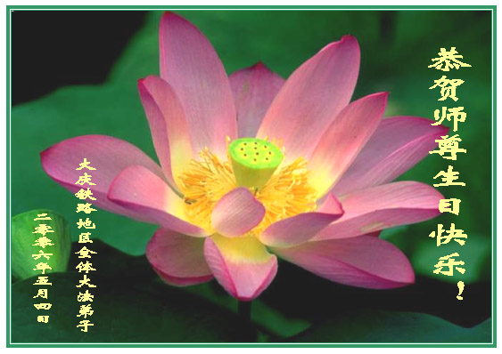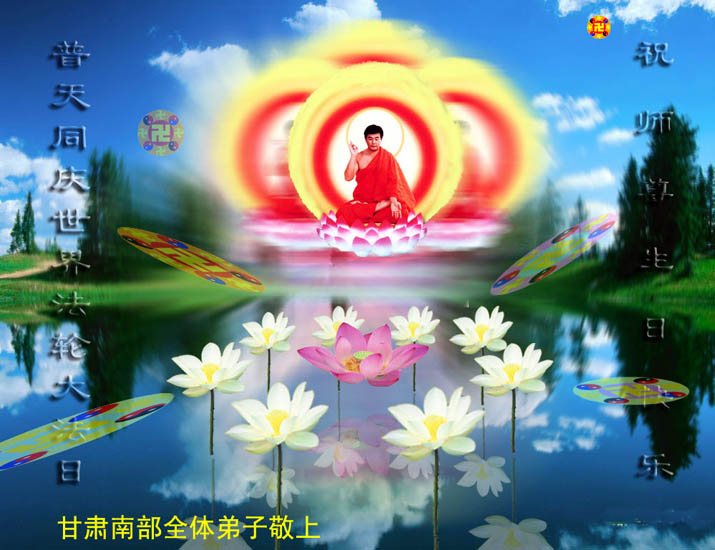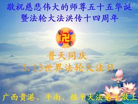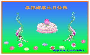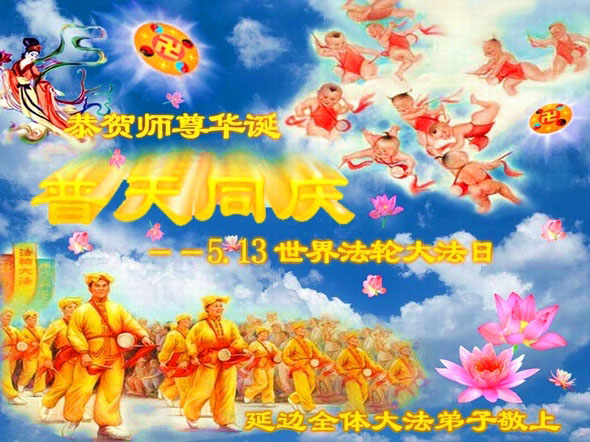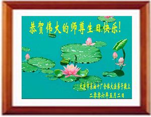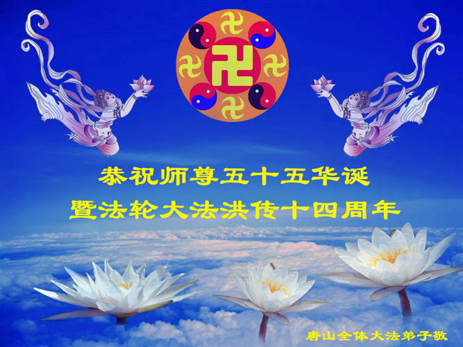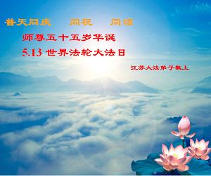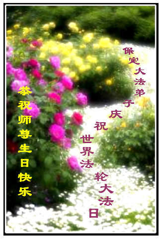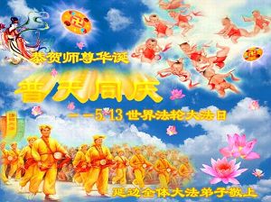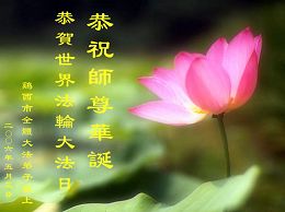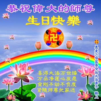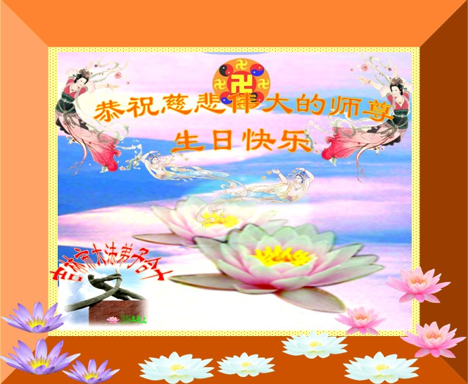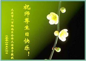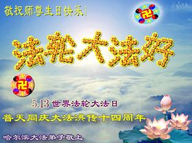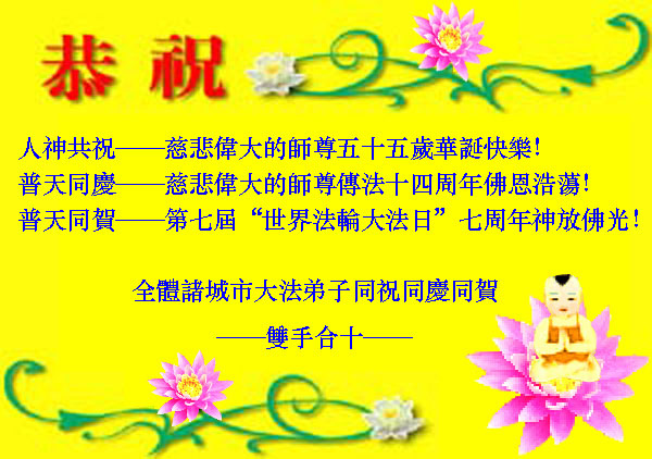 在伟大的师尊五十五岁华诞来临之际,在法轮大法洪传十四周年之际,和第七届世界法轮大法日到来之际,大法弟子们向慈悲伟大的师尊致以最崇高的敬意:恭祝师尊生日快乐!并祝全世界法轮大法弟子节日快乐!普天同庆!同祝!同贺!