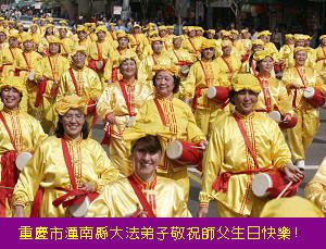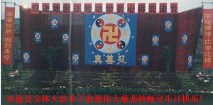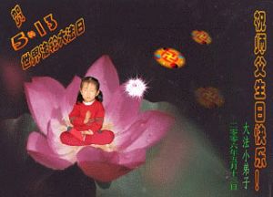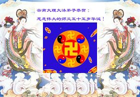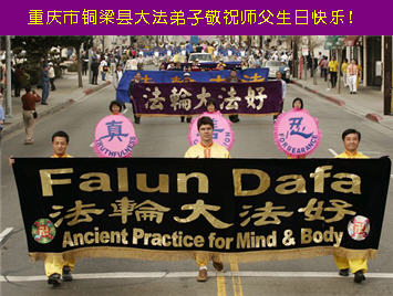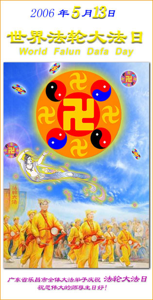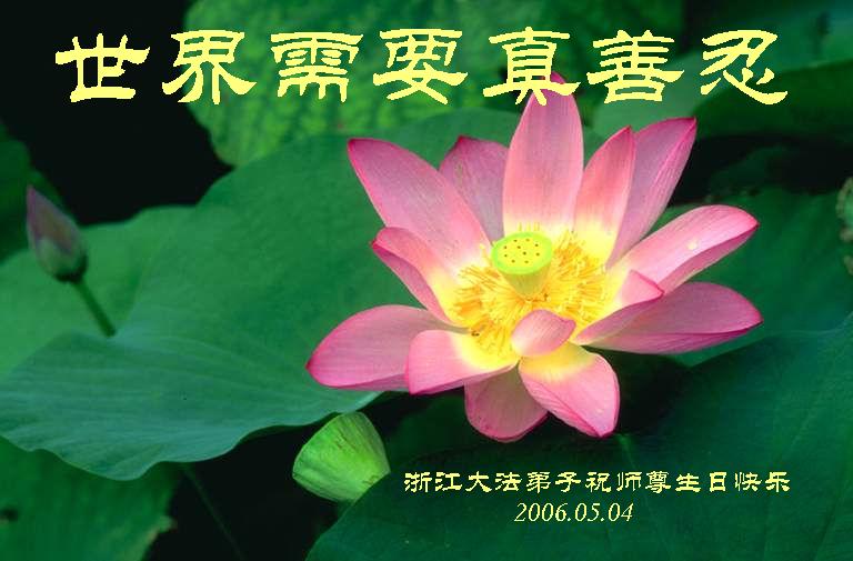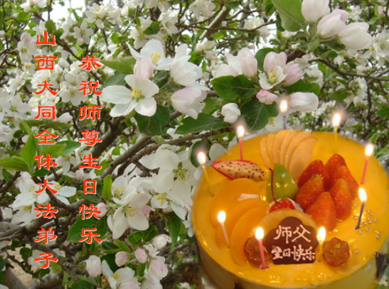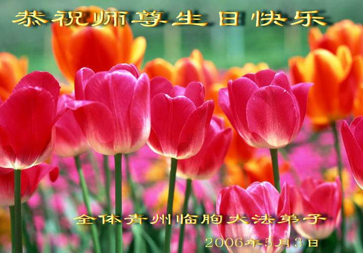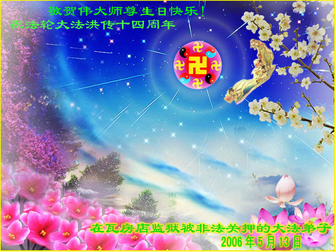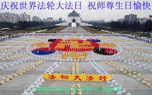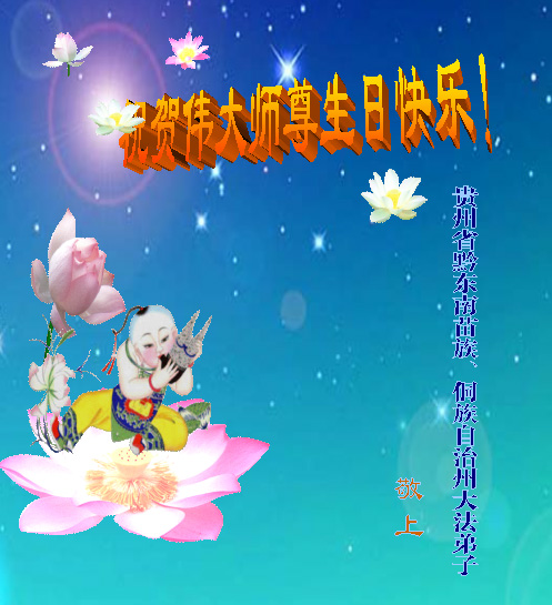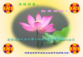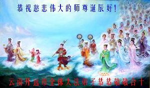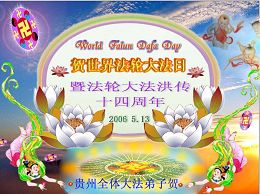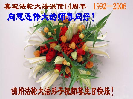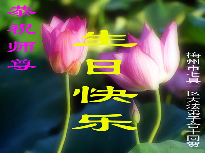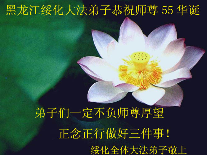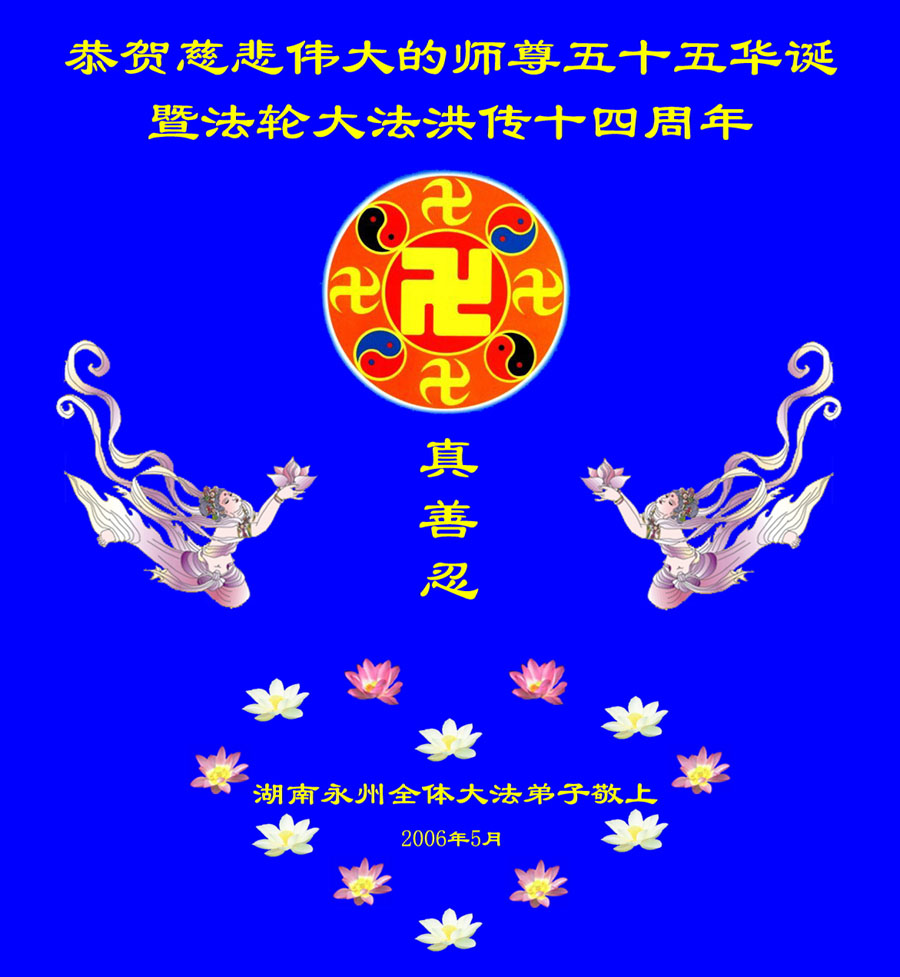 在伟大的师尊五十五岁华诞来临之际,在法轮大法洪传十四周年之际,和第七届世界法轮大法日到来之际,大法弟子们向慈悲伟大的师尊致以最崇高的敬意:恭祝师尊生日快乐!并祝全世界法轮大法弟子节日快乐!普天同庆!同祝!同贺!