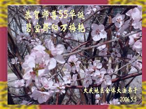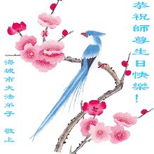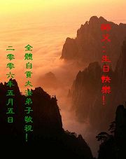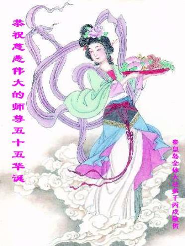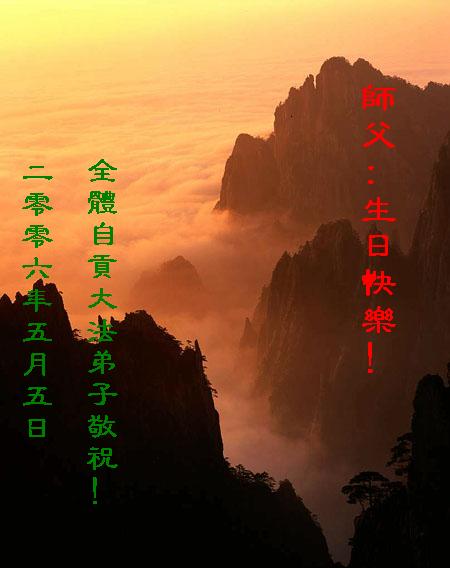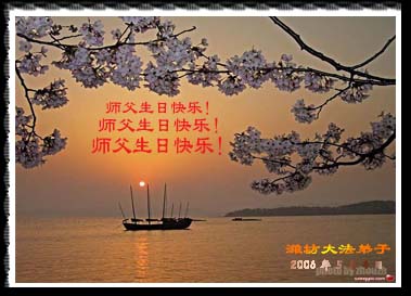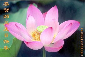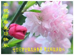 恭祝伟大的师尊五十五岁华诞快乐!在这特殊的历史时刻我们与全世界所有大法弟子普天同庆、同祝、同颂法轮大法洪传十四周年暨第七届世界法轮大法日!敬祝师尊节日快乐!