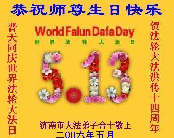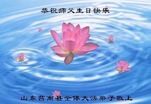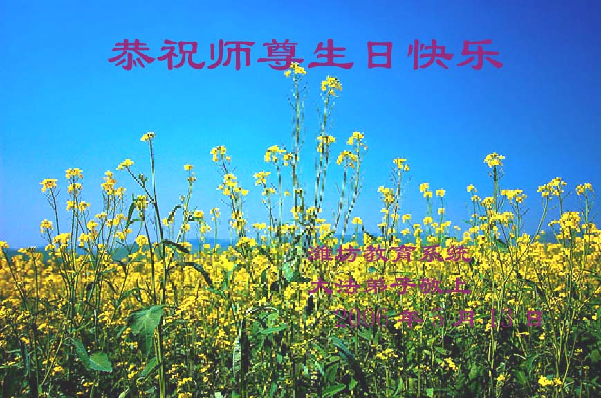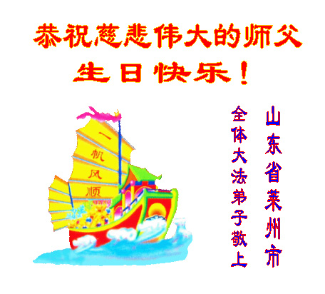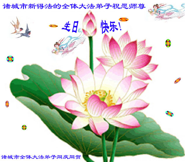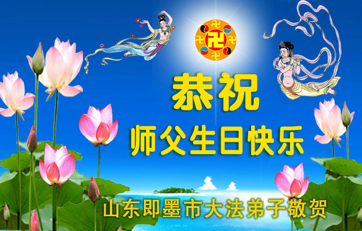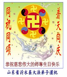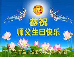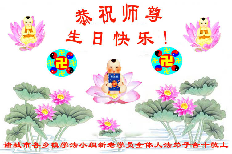 在师尊生日和世界法轮大法日来临之际,山东省诸城市各乡镇的全体大法弟子,向伟大慈悲的师尊问候,并致以最崇高的敬意!热烈祝贺世界法轮大法日,并恭祝师尊55岁华诞!请师尊放心,弟子们一定做好正法时期大法弟子必需做好的三件事,守住正念,不负师恩,不负众生期盼,走好最后的正法之路!