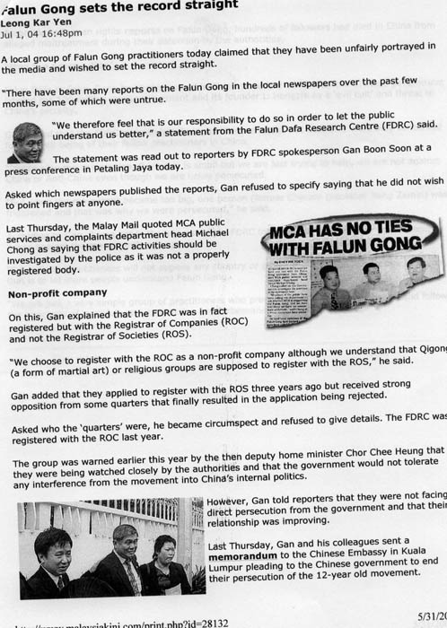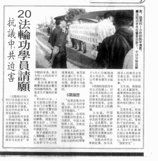 文章说,来自美东南三州、由法轮功学员组成的团队本周一(5月8日)在市政厅外召开新闻发布会,呼吁布什政府撤销对王文怡医生的指控。据报导王医生于4月20日在白宫举行的欢迎胡锦涛的仪式上对胡喊话。