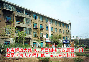 师父家住在建设街和解放大路交汇路口西北角。那是一座已破旧的老式住宅,师父家住在四楼(图一)。朝南的两间套间,仅有二十几平米。里屋是一张床和一个衣柜,外屋是一张桌子,一个长条沙发,一个书橱,书橱上有香炉,香炉里还有半炉的香灰。就是在这间简陋的小屋子里,师父完成了《法轮功》、《法轮功》(修订本)、《转法轮》、《转法轮(卷二)》、《法轮大法义解》这几本大法著作。就是在这小小的屋子里,师父处理宇宙中干扰正法的魔,一坐就是十几天,胡子都长长了也没有时间刮。