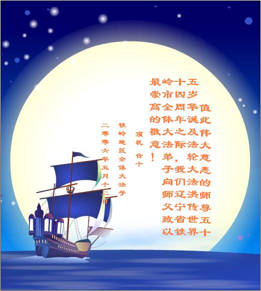 值此伟大慈悲的师尊五十五岁华诞及法轮大法洪传世界十四周年之际,我们辽宁省铁岭市全体大法弟子向师父致以最崇高的敬意!
