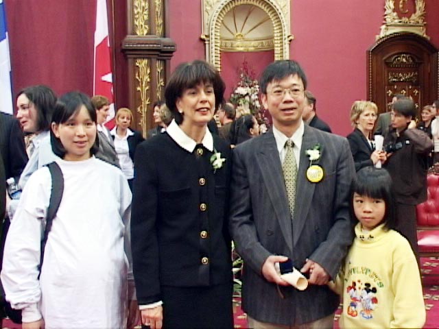 ![]() 陈儒庆、怀孕的妻子及女儿与省移民部长在颁奖仪式上的合影 |