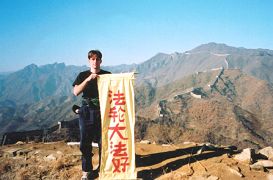 ![]() 泽农在长城展开自制的“法轮大法好”的条幅 |
