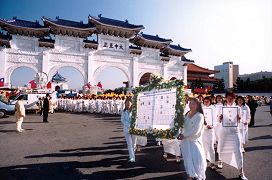![]() 2000年12月24日,来自世界各地的约3000名法轮功学员在台北市游行,声援在中国大陆遭到迫害的同修。 |