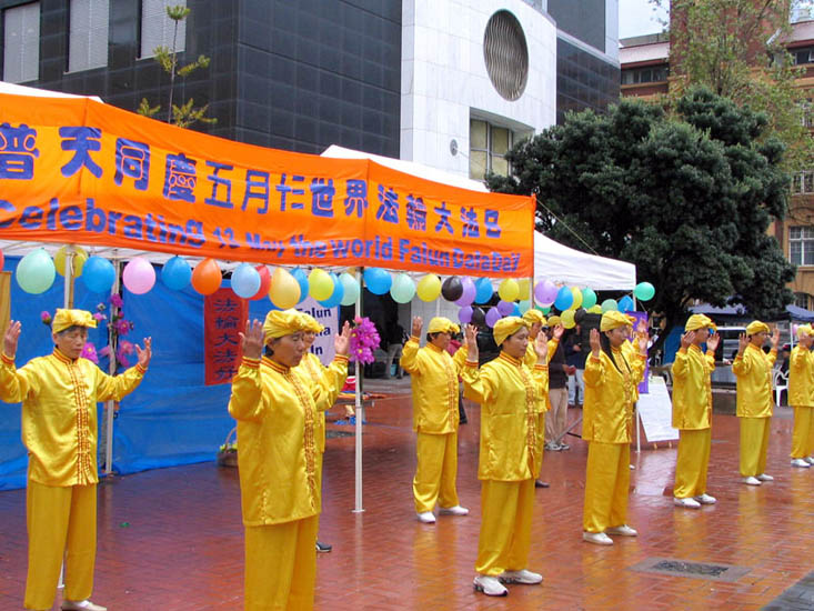 虽然奥克兰阵雨时时,但不减大法弟子和观众的热情,大法弟子精彩的舞蹈、歌曲博得观众阵阵的热烈掌声。路过的行人也纷纷驻足,不少游人还用自己的摄像机拍下了这美好的场面。