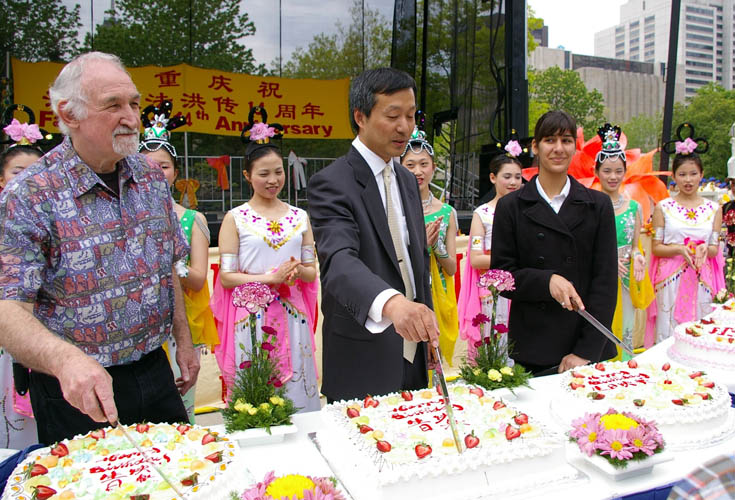 加拿大法轮大法学会代表张照進与贵宾一起切蛋糕