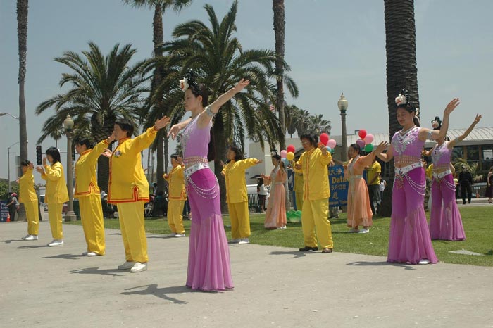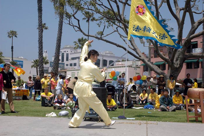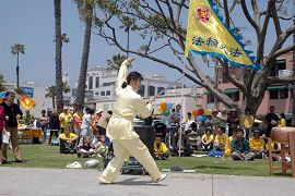 集体大炼功拉开了庆祝盛典的序幕。宁静安详的炼功场面,吸引了游人驻足观看,一对从欧洲来的年轻夫妻当即就学习了功法。