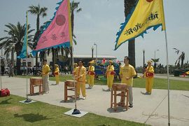 五彩的“真善忍”旌旗在和风中起舞,“法轮大法好”、“世界需要真善忍”横幅在阳光下放出祥和的光彩。