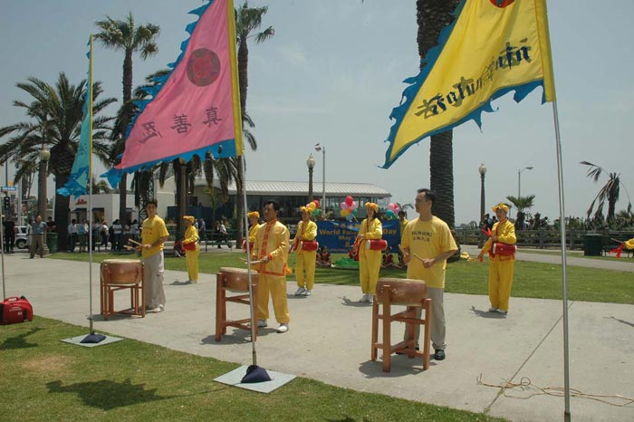 ![]() 腰鼓和唐鼓合打 :伴随着《法轮大法好》的乐曲,鼓声阵阵、摧枯拉朽,扫除一切败物,天清体透乾坤正。 |