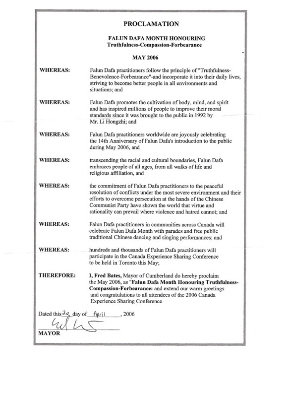 鉴此,我,弗莱德·贝迪斯(Fred Bates),坎伯兰市市长,宣布2006年5月为颂扬真、善、忍的法轮大法月”,并向即将前来参加加拿大2006年心得交流会的所有与会者表达问候和祝贺。