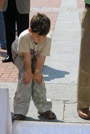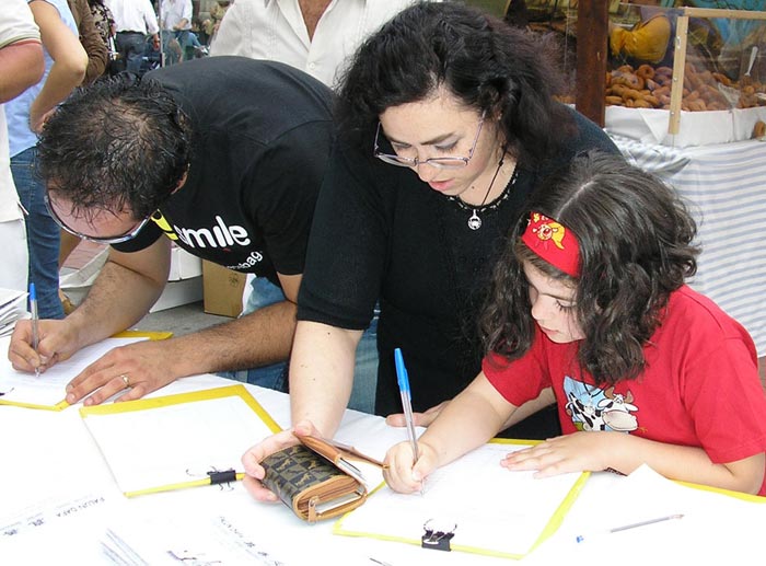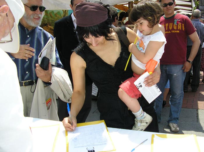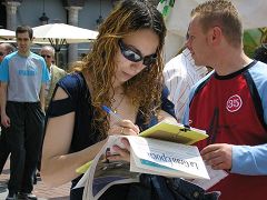 一边是祥和优美的功法演示,另一边是惨烈的迫害,这强烈的反差立即引来了人们的关注,很多人索要真相报纸和VCD,也有一些急于参加节日盛会的人,接过资料后,边走边读,当读明白时,特意返回来签字支持法轮功;有的人当场学习五套功法。