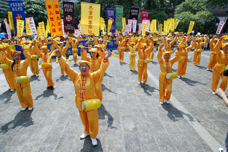 学员集体炼功后,在灿烂的阳光下,张起色彩缤纷的横幅与幡旗,在一轮雄伟的腰鼓表演后,大家齐声恭贺师尊生日快乐,随后还高唱“法轮大法好”、“师父啊,谢谢您!”、“为你而来”等歌曲。