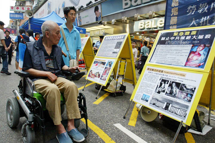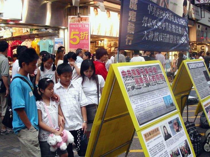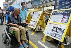 ![]() 下午在旺角街头举办反酷刑展,吸引大批市民观看。 | ![]() 市民神情凝重的观看揭露中共暴行的展板。 |