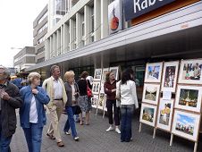 法轮大法洪传世界十四周年,很多珍贵的历史时刻通过照片记录了下来,由此制作的32幅照片在河林街头展出,让人们了解大法的美好殊胜。
