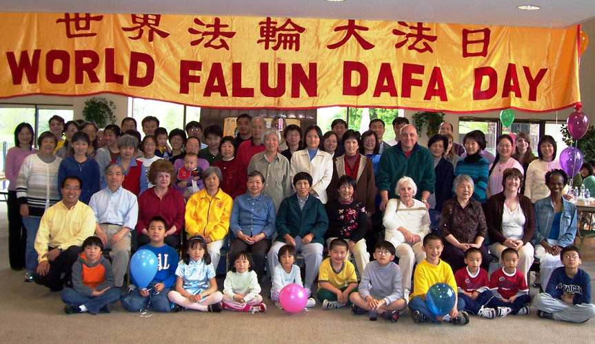 大厅上面悬挂着“世界法轮大法日”的巨幅标语,四周用一朵一朵的大莲花装点着。气氛热烈欢快。