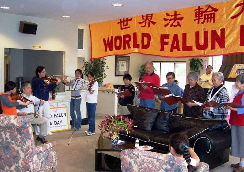 午间,大家分享了学员们为庆贺师尊五十五华诞而准备的生日蛋糕和丰盛的菜肴。此间“老少乐队”的乐器合奏出台了,演奏了歌曲“请与我比邻而坐”。尔后,老年合唱团分别用中、英文唱了这支歌曲。最后大家一起合唱了“法轮大法好”。